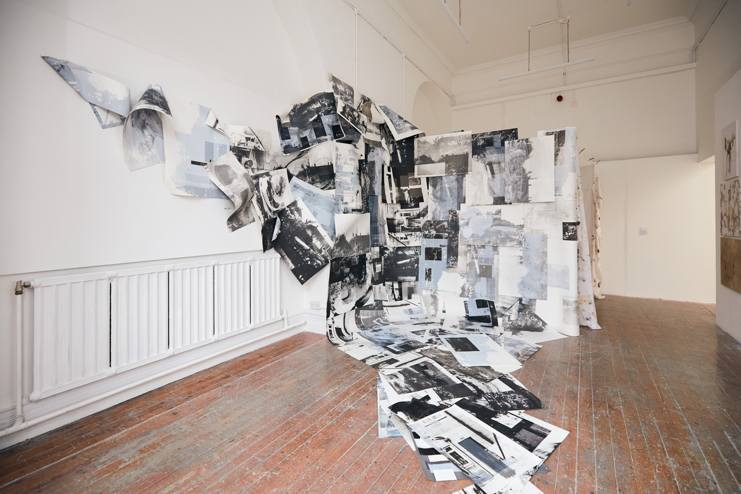 A large, curved sculpture made from cut cardboard. The sculpture resembles a large wooden curved shape, and stands upright against a white wall